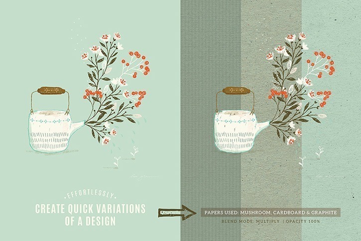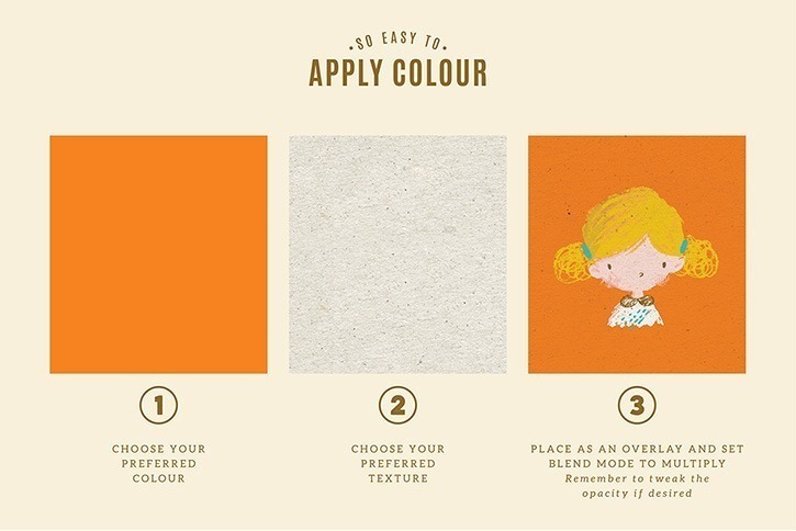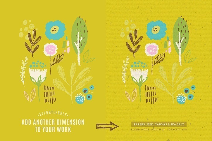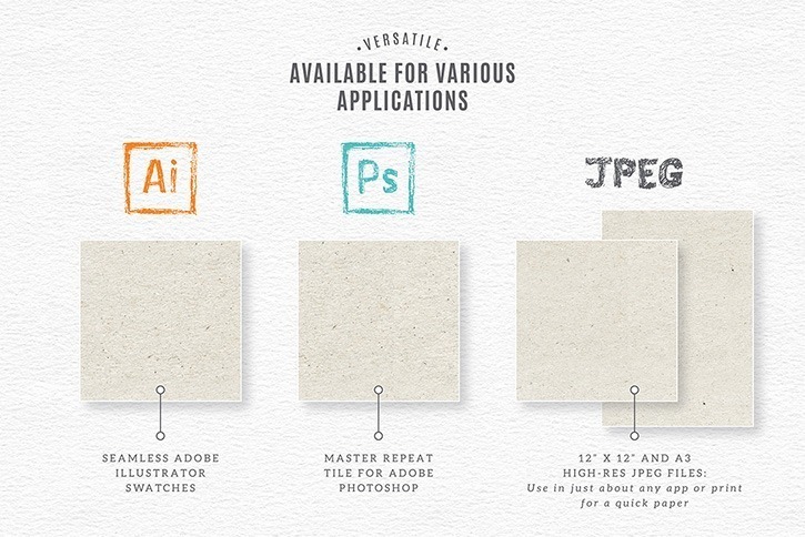 From lovely subtle papers perfect for watercolour work, to chunky craft paper textures, this pack has it all. Use the seamless textures as an overlay to give your digital illustrations and designs a hand crafted look. A handy pack to have on hand for a quick texture boost!