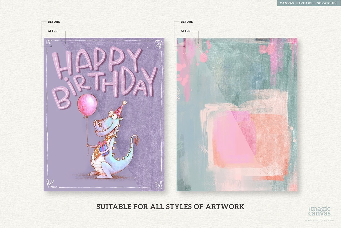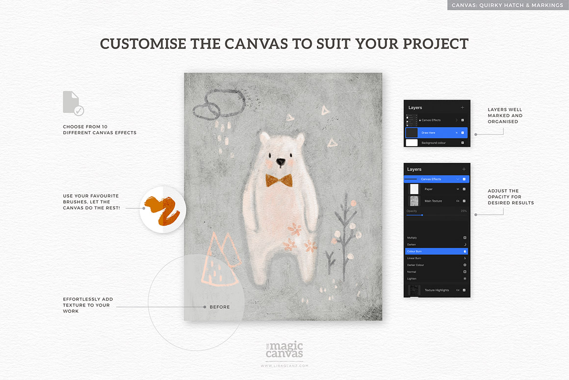 Each of the 10 canvases have been developed and created to produce different results, making adding texture as simple as turning on the layers.