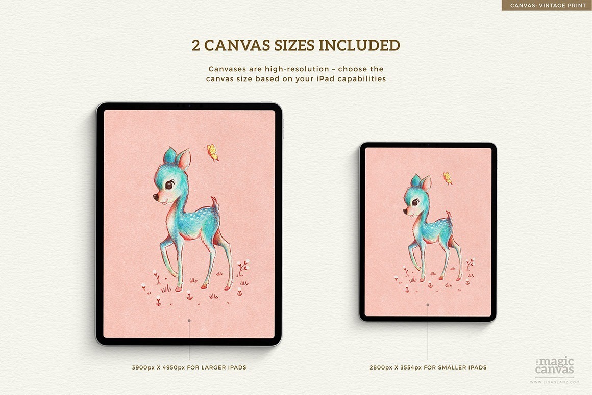 Canvases are high-resolution at 300dpi. Choose from 3900px x 4950px documents (for larger iPads) or 2800px x 3554px documents (for smaller iPads) depending on your iPad size and capabilities.