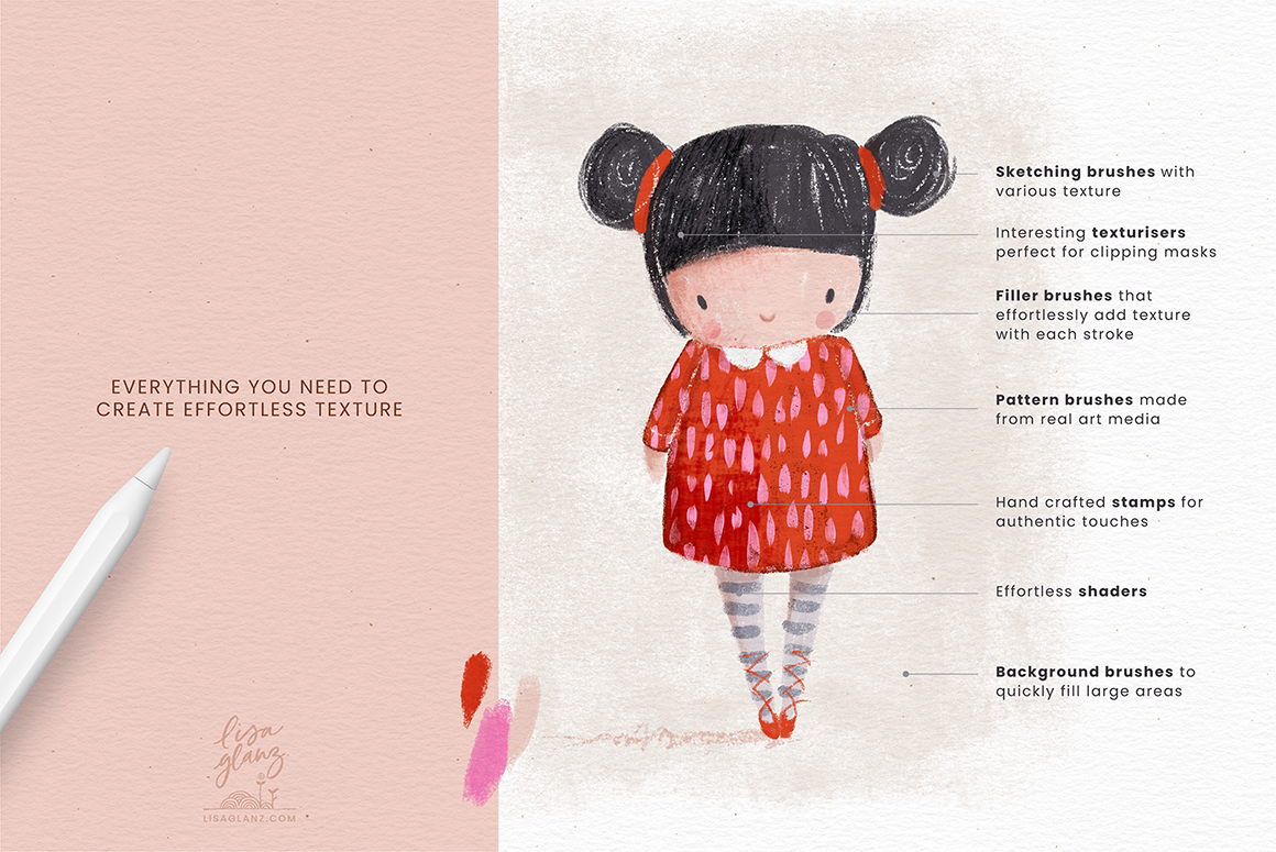 From Sketching Brushes, Fillers, Texturisers, Stamps and everything in between, you’ll be producing lavish texture-rich work in a jiffy!