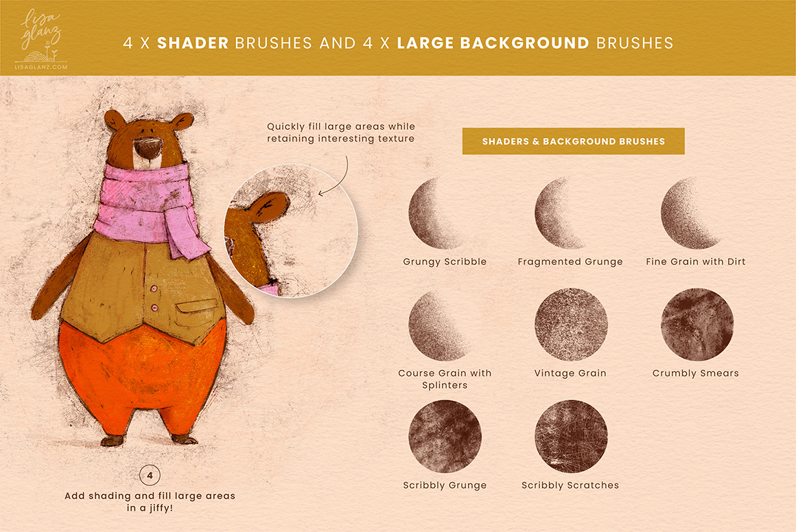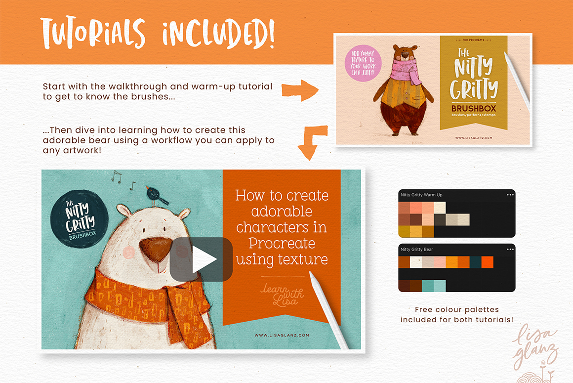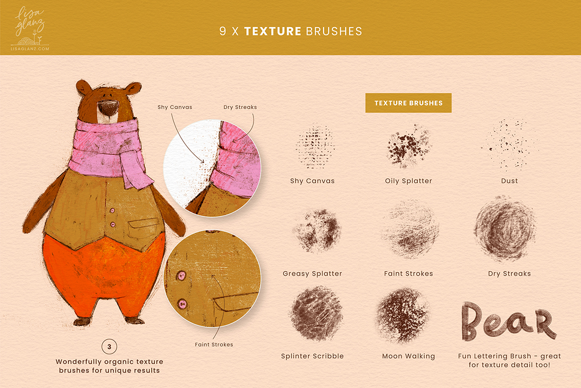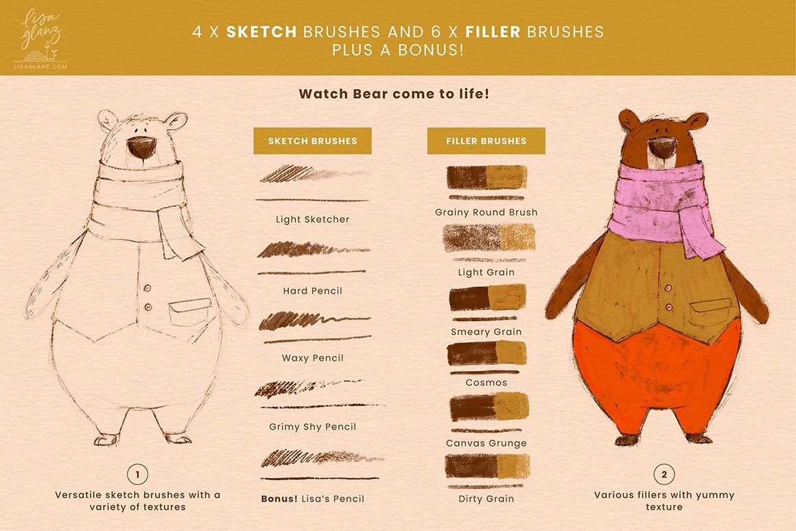 Included in the download (or watch below) you’ll find links to a walkthrough and warm-up tutorial to familiarise yourself with the brushes. Then dive into learning how to create an adorable bear using a workflow you can apply to any artwork!