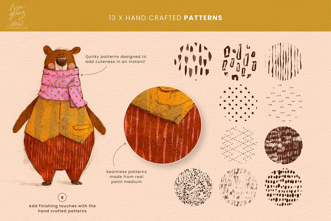 The collection is designed specifically for creating adorable whimsical artwork, perfect for character design, children’s book illustrations and gorgeous surface design works of art.