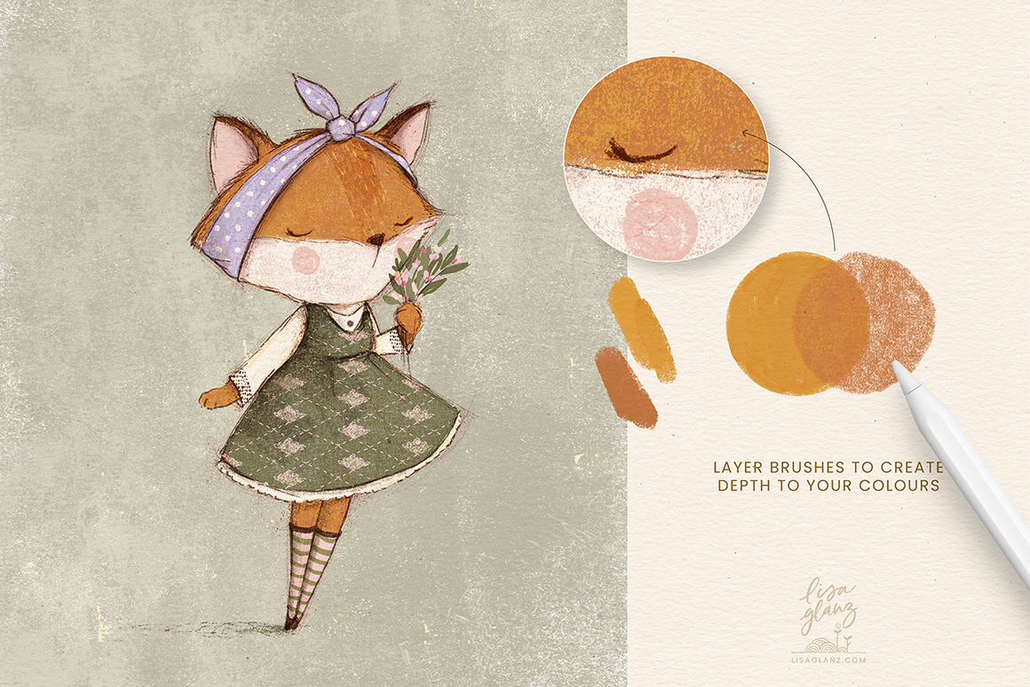 Hi Nadja, Thank you so much for your lovely comments! I’m so happy you’re enjoying the brushes. Of course, I’d be happy to share which brushes I used for the cute fox lady! Just a quick tip to mention, the size of your canvas and size of your illustration will effect the final look due to the brushes having texture and grain. My canvas was fairly large 4950px x 6300px. To explain further, if you draw a small object and very large object with the same brush, the grain will have a different effect/result on the final look. This is why I’ve included the canvas size I used in the fox illustration. Here is a jpeg image of the two brushes I used and the colours: https://www.dropbox.com/scl/fi/wekzqcuukilncxyvo628d/fox-illustration-brushes.jpg?rlkey=m2lsbxotf10609x9eicak4fdi&dl=0 Hope that helps! If you have any other questions at all, please don’t hesitate to let me know.