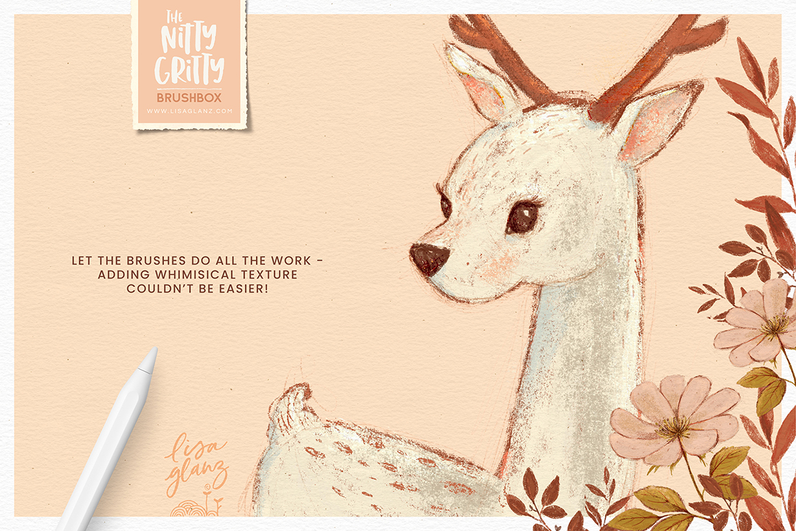 Hi Jay, So glad you’re enjoying the brushes! Here’s a link to all the tutorials available for the Nitty Gritty pack. I don’t unfortunately have one for the deer. But essentially I followed very similar steps to the bear tutorial. I started with a dark brown under the deer, then used the Smeary Grain on top using a light cream. To add more texture on top of that I used the Light Grain brush in a grey shade to create the shadow effect, then blush for the cheeks etc. Aim to create depth by layering the texture brushes. Experiment with shade variations to get interesting results. Hope that helps! If you have any other questions at all, please don’t hesitate to let me know.
