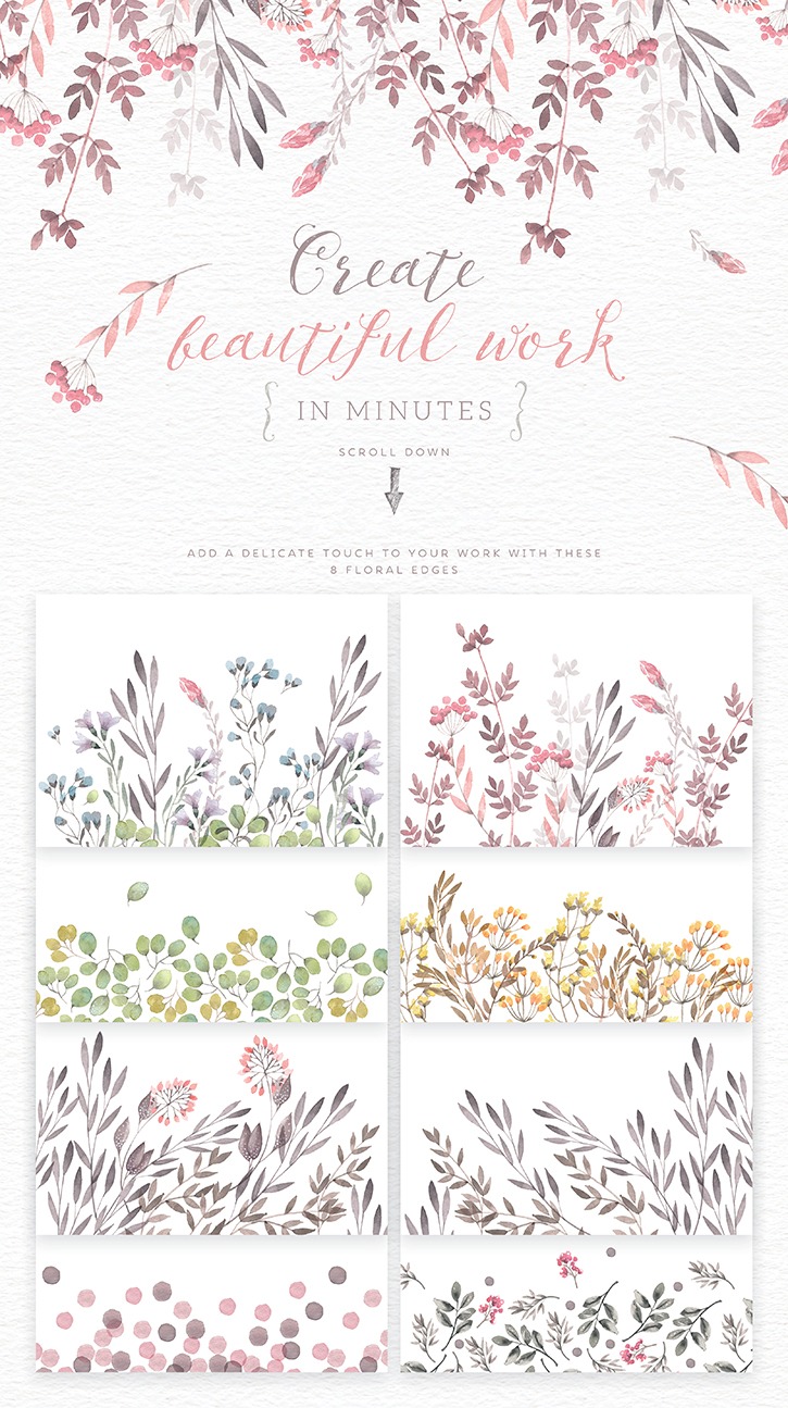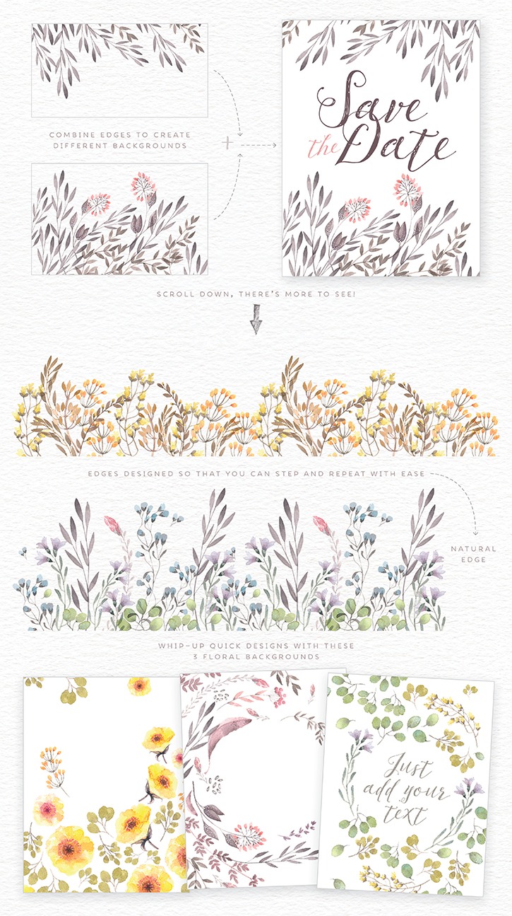 A watercolour collection of delicate wild flowers, hand painted floral edges and botanical frames, perfect for wedding, branding and nursery art.
